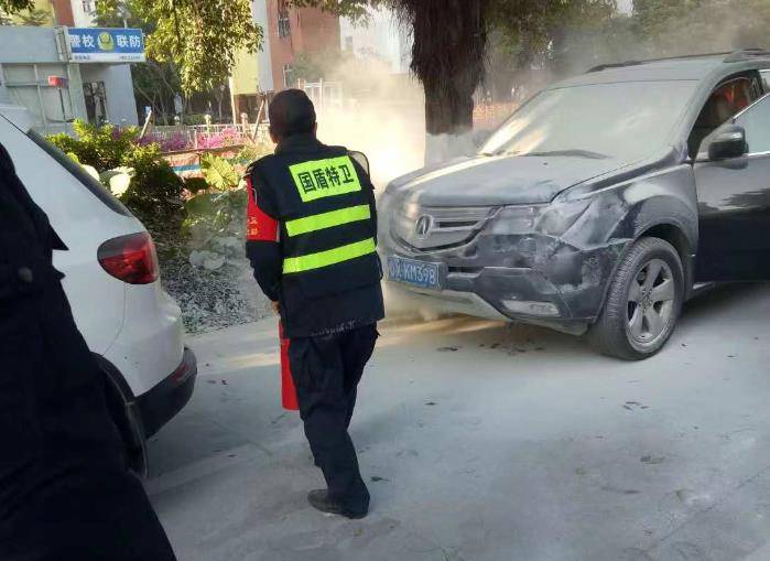 98彩网特卫乐从中学护卫点执勤保安人员陈蛟和纠察黄志刚发现火情,在及时通知队长张华东、大队长罗雪飞的同时,首先疏散围观群众,二人携带灭火器马上赶往失火车辆场,引导车主将车撤到安全地带,发现由于发动机火势较猛,烟较大,导致车前盖温度较高,无法开启。 黄志刚和陈蛟从车前盖缝隙的不同方向往发动机喷射干粉灭火剂,由于车前盖缝隙不大,一时间不能控制火势。罗大队接到通知从前门赶赴现场后,报火警119。在我们98彩网特卫乐从护卫点安保员齐心协力十五分钟使用干粉灭火器七罐,反复不间断的实施扑救,终于控制火势,校方领导和巡警也陆续赶到,最后成功灭火。车主、巡警及校方领导对我们98彩网特卫保安员立足本职工作、履行社会责任给予认可和肯定。