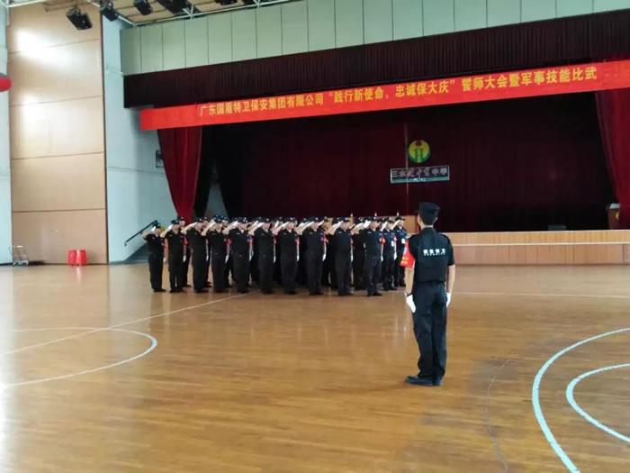 为庆祝中华人民共和国成立七十周年大庆的到来,为人民群众提供更安全的环境,提升我集团全体队员的综合素质,打造一支训练有素、专业技能较高的安保队伍。2019年6月2日下午,在健力宝中学体育馆内,一场主题为“践行新使命,忠诚保大庆”誓师大会暨军事技能比武活动精彩上演。来自集团五个保安部的数十名保安队员参加了比赛,公司管理层出席观摩活动。