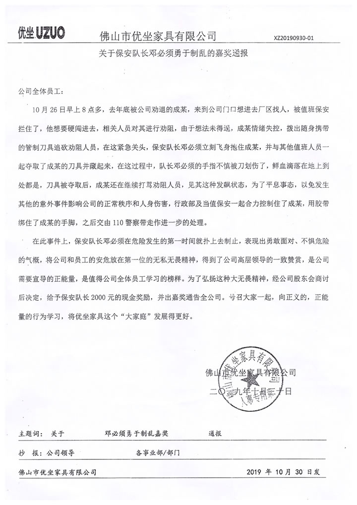 在此事件上,保安队长邓必须在危险发生的第--时间就扑上去制止,表现出勇敢面对、不惧危险 的气概,将公司和员工的安危放在第一位的无私无畏精神,得到了公司高层领导的-致赞赏,是公司 需要宣导的正能量,是值得公司全体员工学习的榜样。为了弘扬这种大无畏精神,经公司股东会商讨 后决定,给予保安队长2000元的现金奖励,并出嘉奖通告全公司。号召大家一起,向正义的,正能 量的行为学习,将优坐家具这个“大家庭”发展得更好。