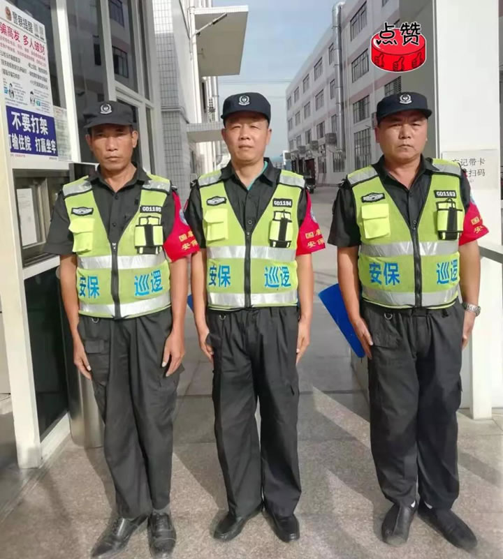 邓必须队长(图右一)与当班两名队员勇于担当、及时制乱,维护了客户公司内的安全秩序和人身安全。