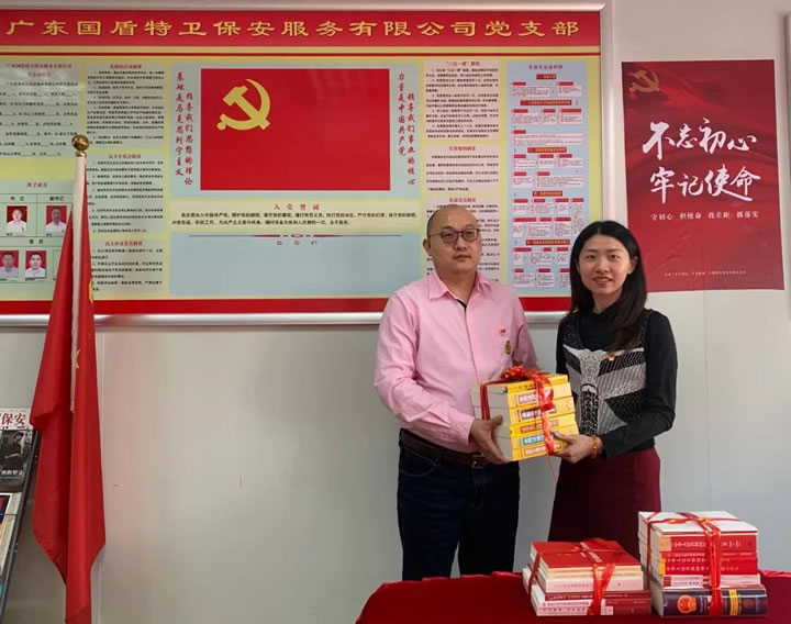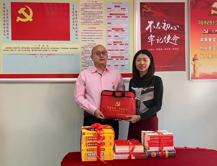 为积极响应“推动全民阅读,建设书香社会”的国家文化发展战略目标,以创建综合文化服务中心为契机,推进“两新”党组织建设为抓手,大力整合资源,携手非公企业开展多项活动,深入贯彻“不忘初心、牢记使命”主题教育的开展。11月27日早上,三水区云东海街道组办在我司党支部党建会议室举行了简单却有意义的图书捐赠仪式,几十册捐赠书籍整整齐齐地排列在桌上,显得格外有厚度、有温度。我司党支部书记、集团公司董事长夏学树接受云东海街道的捐赠,同时云东海街道组办相关负责人为我司党支部颁发给流动党员“红色书包”,双方留影记录了这一有意义的美好时刻。