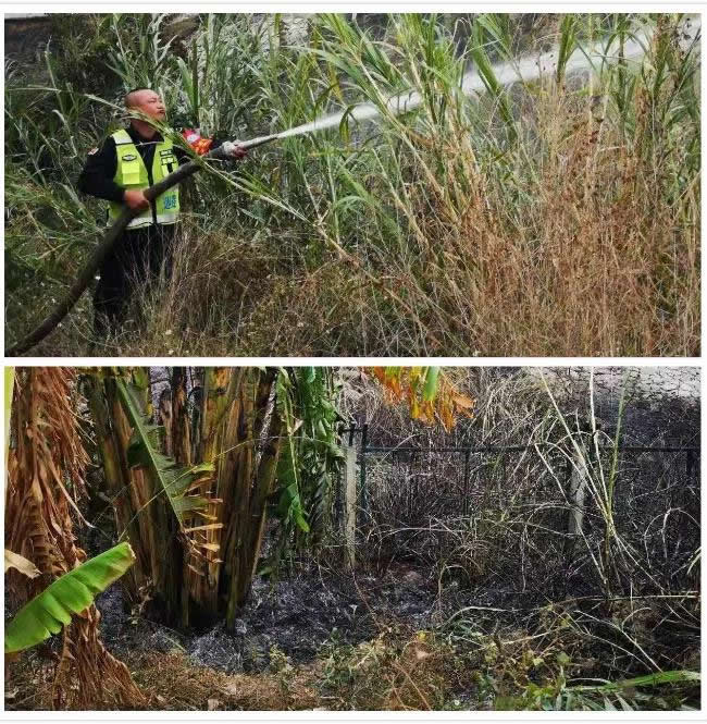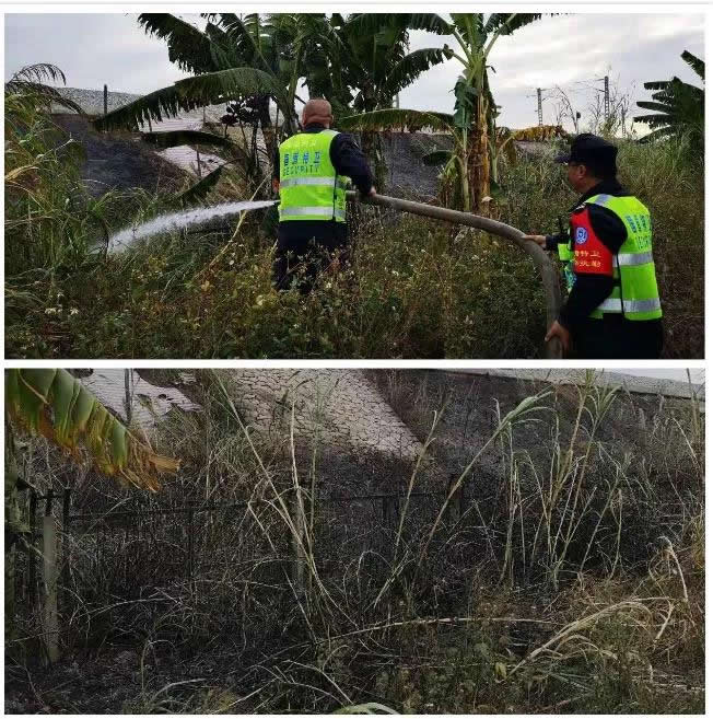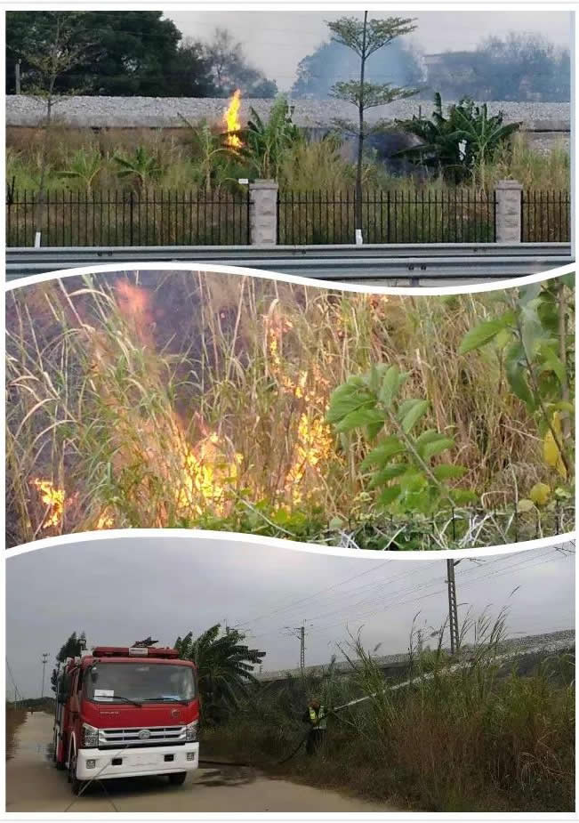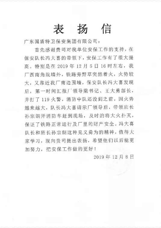 2019年12月5日下午16时许,北汽福田厂西南方向院墙外铁路边突然着火,我司派驻北汽福田厂保安队长冯大喜第一时间发现火情,立即前往现场查看,并及时向厂相关部门领导上报情况和报119火警,又因火势较大,特向厂相关部门领导请示启用厂内消防车进行灭火。获得批准后,队长冯大喜带领班长孙宗朗开消防车到现场进行灭火,防止火势进一步蔓延。10分钟后,专职消防队赶到火警现场,经过联合扑救,及时将大火扑灭。