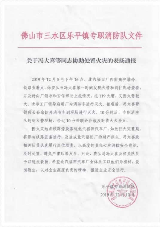日前,三水区乐平镇专职消防队和北汽福田汽车厂特向我司和冯大喜等同志发来了表扬通报。