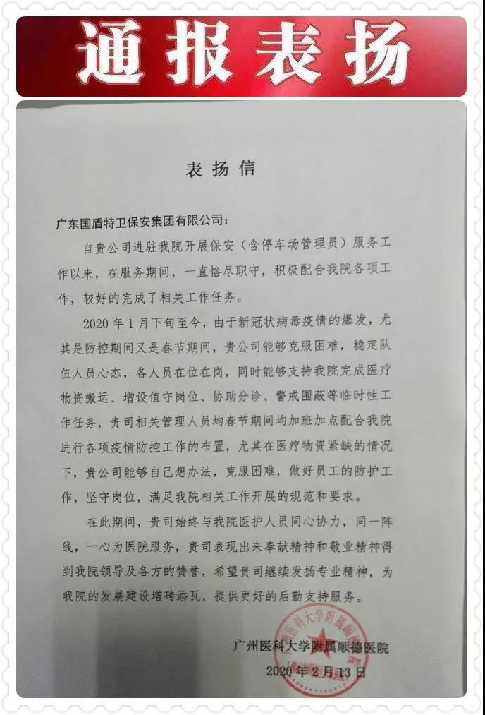 疫情当前,我司保安员无论深夜,还是清晨,都一直默默坚守各自岗位护佑平安,始终与医护人员同心协力,打赢这场疫情防控阻击战。保安员表现出来的无私奉献和爱岗敬业精神,赢得了广州医科大学附属顺德医院领导及各方的一致赞誉。