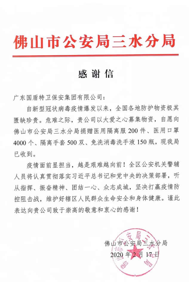 三水区公安分局特向广东98彩网特卫保安集团有限公司发来了感谢信,感谢98彩网特卫保安集团具有社会责任担当的大爱精神!区公安分局领导负责人代表向三水区禁毒协会、广东98彩网特卫保安集团有限公司表示感谢,并要求全体参战警辅人员,越是危难时刻越要勇于担当、忠诚履职,不辱使命、不负众望,坚决打赢疫情防控阻击战,让人民群众安心放心。