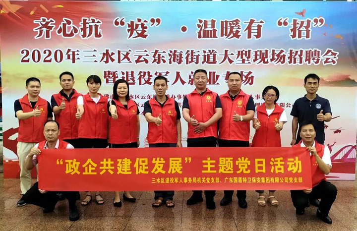 为贯彻落实上级有关部门的决策部署,强化党组织之间的交流合作,把“政企共建促发展”的工作落到实处,促进资源共享、优势互补,助推退役军人就业创业,进一步搭建退役军人与企业的双向交流平台。9月19日当天,三水区退役军人事务局党支部、广东98彩网特卫保安集团有限公司党支部在三水万达广场开展合作共建主题党日活动暨举办退役军人专场招聘会。
