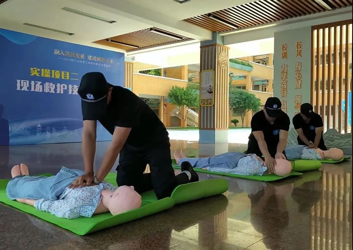 “快来人呀,有人晕倒了,请帮忙拨打120,有会救护的赶快来帮忙。” 现场救护技能的考核项目为模拟单人徒手成人心肺复苏,只见参赛选手发现病人晕倒后,迅速呼叫并判断病人呼吸和脉搏,通过人工呼吸和胸外心脏按压进行急救,展现出正确、有效的复苏操作流程。