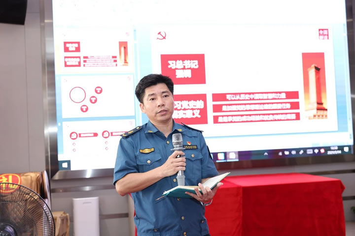 其后,湛江市交通运输局执法一科科长付雪松同志带领大家一起回顾了党的百年发展历程,共同追忆峥嵘岁月、感悟初心使命,引导党员切实增强责任担当,做到知史爱党、知史爱国,党中央有号召、共产党员有行动。付雪松同志讲述到:近代以来,在中国和世界舞台上政党繁多,难以数计,但是像中国共产党这样,成立百年,引领中华民族站起来、富起来、强起来。付雪松科长结合视频、图片等资料分别从新民主主义革命时期、社会主义革命和社会主义建设时期、改革开放和社会主义现代化建设时期系统回顾了革命战争年代的艰苦创业史和新中国发展壮大的光辉历程,学习我们党和国家的基本历史经验。付雪松科长强调,2020年突如其来的新冠疫情,是对国家治理体系和治理能力现代化一次大考,在以习近平同志为核心的党中央坚强领导下,常态化疫情防控和经济社会发展“双统筹”稳步走向“双胜利”,彰显“中国之治”生动实践和显著优势。