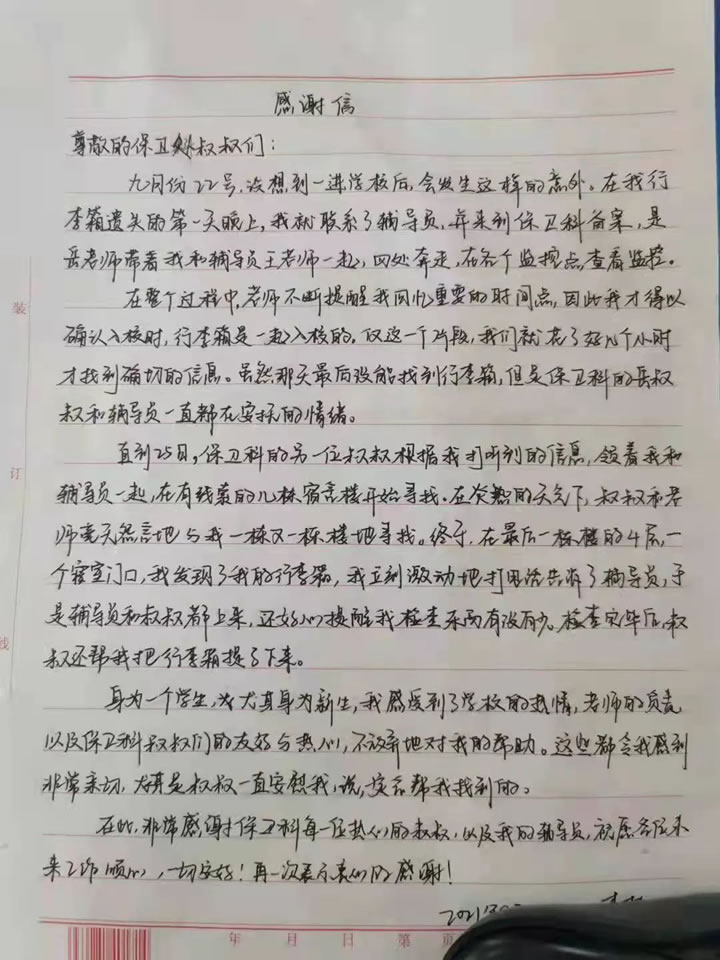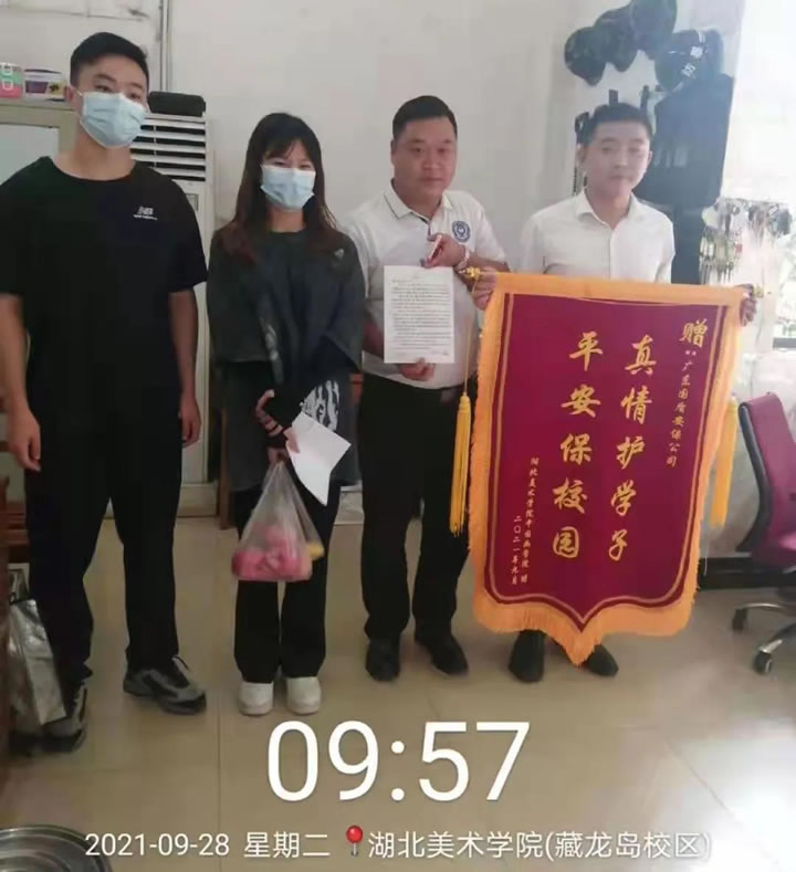 2021年9月28日早上,集团湖北分公司驻湖北美术学院项目部值班室收到来自国画系学生送来一面锦旗以及一封亲笔书写的感谢信。该学生为感谢我司驻项目经理岳凌同志过去几天帮助同学找回丢失的行李,特意亲自递上水果作为答谢心意,被岳凌经理礼貌婉拒。岳经理接过锦旗后表示这是一件很平常的小事,我们驻守校园的初心就是全心全意为校园师生服务,坚持做好自己的本职工作。