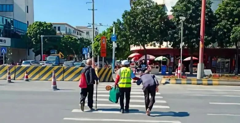 2021年12月7日中午,在大塘镇商业城农商银行门口的斑马线上,车流量大又没有红绿灯,一名身着绿色背心头戴白色帽子的交通劝导员一边引领老人家,一边扶着老婆婆过马路,慢慢一步一步的帮助他们走过马路...