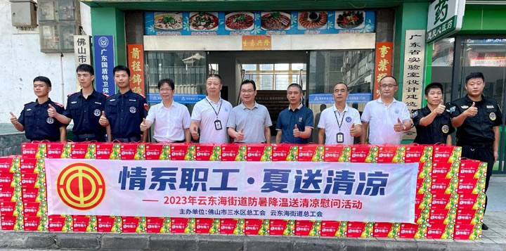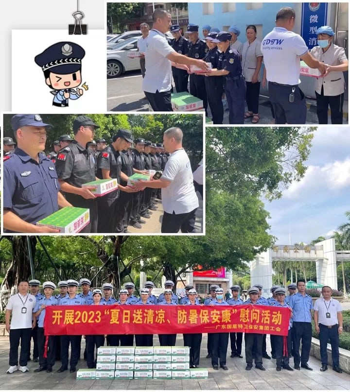 在三水区总工会、云东海街道党工委的支持下,为将集团公司对员工的关心关爱送到一线,贯彻落实基层一线防暑降温措施,自7月份起,集团公司工会组织开展“夏日送清凉、防暑保安康”活动,集团公司党支部书记、董事长夏学树亲自部署,要求服务管理部各级管理人员落实传达公司的关心关爱精神,以关心一线队员工作和生活为出发点,各护卫点负责人结合夏日实际科学合理安排岗位,叮嘱一线队员加强自我防护,及时补充水分,时刻关注自身健康状况,积极投身协助维护治安、城市管理创文建设工作中去,继续发扬特别能吃苦、特别能奉献、特别能战斗的优良作风,高质量做好驻点安保服务。