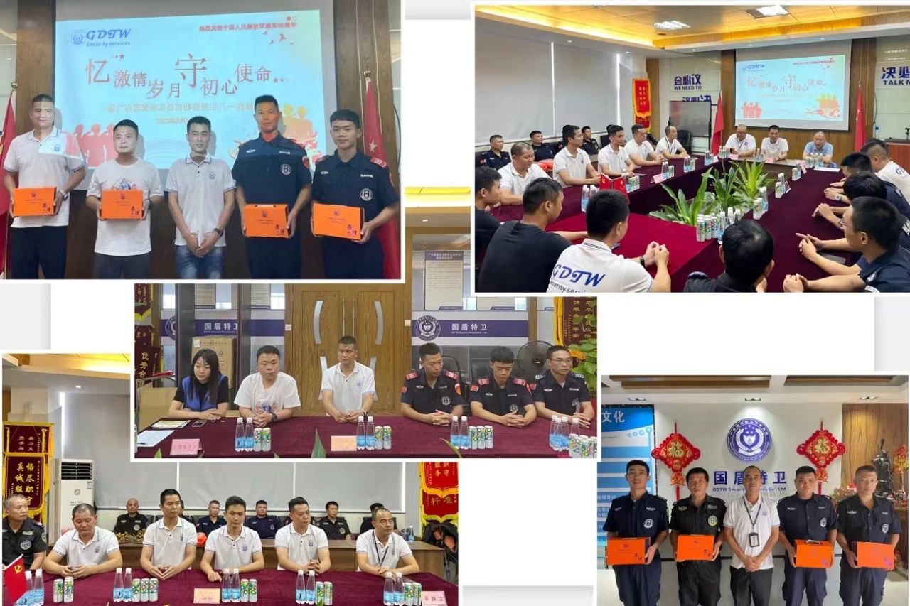 在中国人民解放军建军96周年到来之际,为贯彻习近平总书记关于退役军人工作重要论述,落实党中央、国务院有关决策部署的相关要求,大力弘扬军爱民、民拥军的光荣传统,凝聚军民携手奋进、攻坚克难的强大力量,更好地发挥退役军人的工作积极性。8月1日下午,广东98彩网特卫保安集团组织公司各部门的退役军人代表开展以“忆激情岁月,守初心使命”的八一主题系列活动,动员和激励公司退役军人不忘初心、奋发有为,在新时代、新征程上听党话、跟党走,为保安事业和集团发展作出积极贡献。